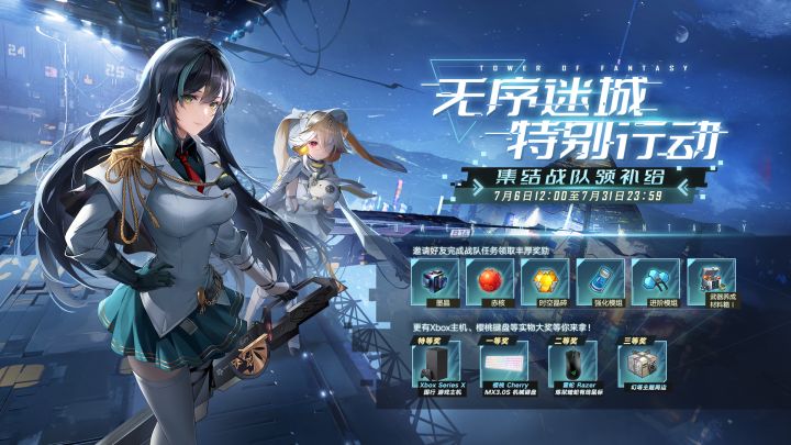 遇上迷城,玩定迷城,组成战队,一起出发拓荒者,和好友组成战队,共同探寻宝藏吧++活动时间++7月6日12:00至7月31日23:59。++活动说明++游戏内参与“无序迷城 特别行动”集结活动,发送邀请码邀请好友回归/注册组建战队,完成系列任务共领丰厚奖励!完成进阶任务还能获得幸运抽奖机会,Xbox游戏主机、樱桃键盘等实物大奖等你来拿!详情请前往游戏内活动页面查看。