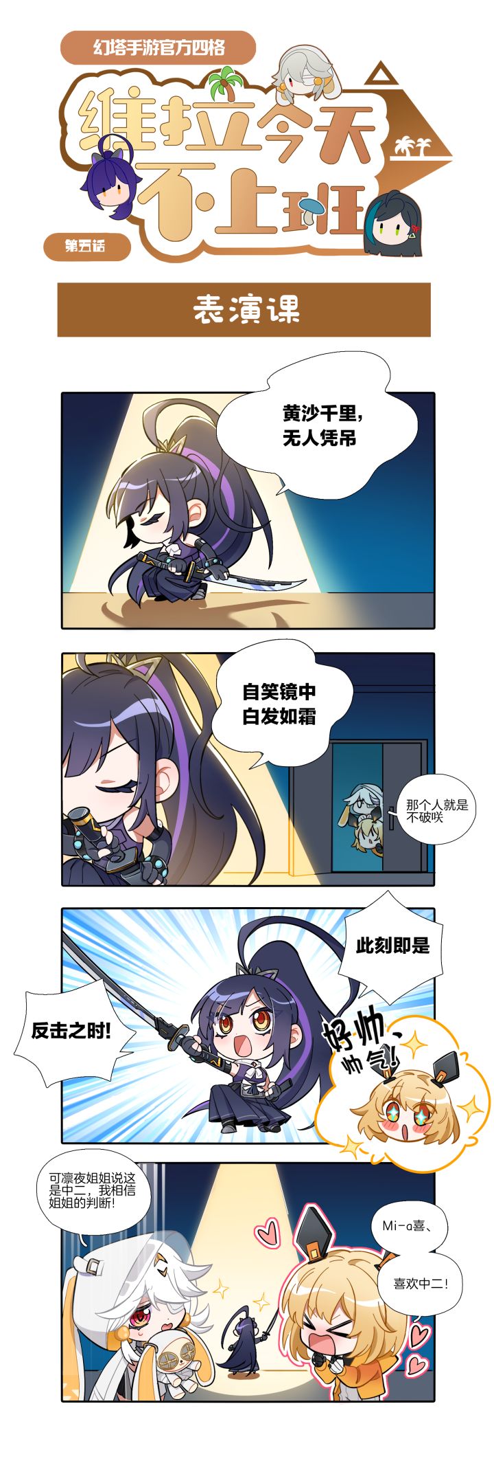 不上班但上线~2.1版本无序迷城+四格漫画第四季《维拉今天不上班》第五话来咯~不破咲的私人日记0708:黄沙千里无人凭吊自笑镜中白发如霜今日表演课的最佳时刻,天才咲的灵光一闪!ε=(´ο`*)))唉,没人懂天才的寂寞,真是可惜……