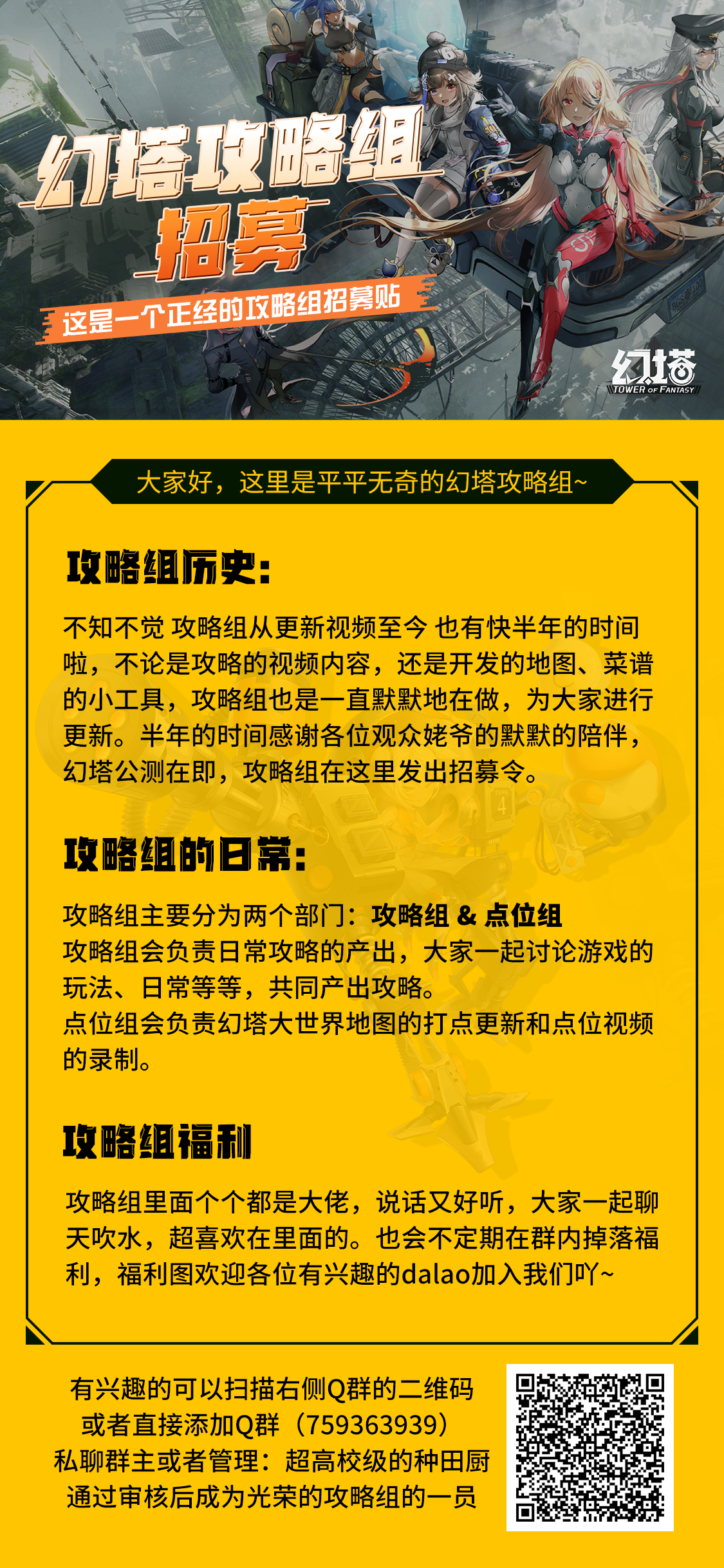 大家好,这里是平平无奇的幻塔攻略组~不知不觉 攻略组从更新视频至今 也有快半年的时间啦,不论是攻略的视频内容,还是开发的地图、菜谱的小工具,攻略组也是一直默默地在做,为大家进行更新。半年的时间感谢各位观众姥爷的默默的陪伴,幻塔公测在即,攻略组在这里发出招募令,有兴趣的可以私聊我,加入我们攻略组哦~攻略组の日常:攻略组主要分为两个部门,攻略组与点位组攻略组会负责日常攻略的产出,大家一起讨论游