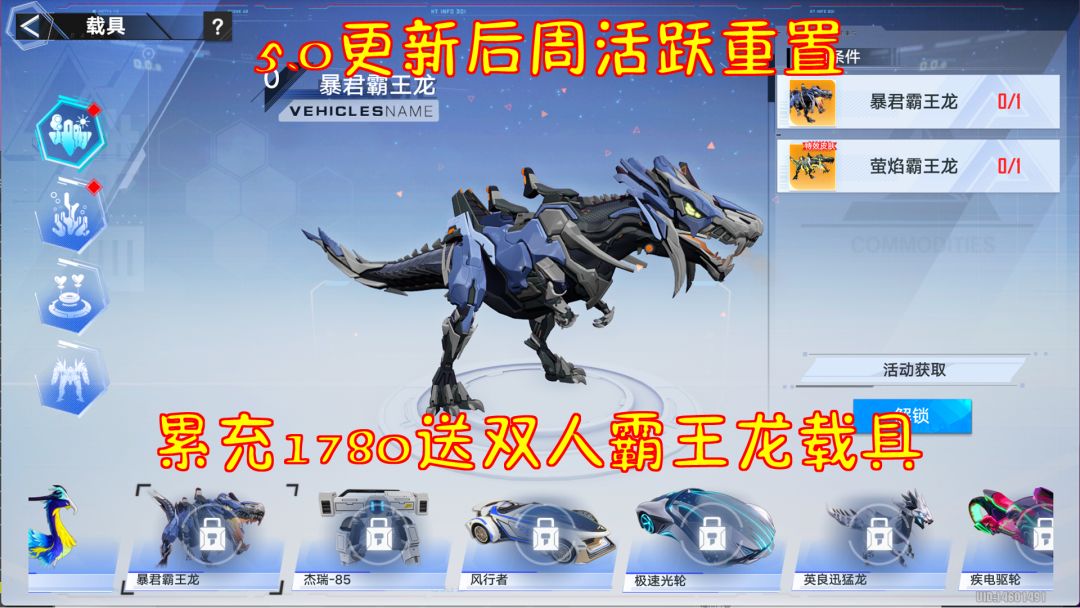 #游戏冒险家大集结 幻塔:5.0更新后周活跃重置!累充1780送双人霸王龙载具!#幻塔