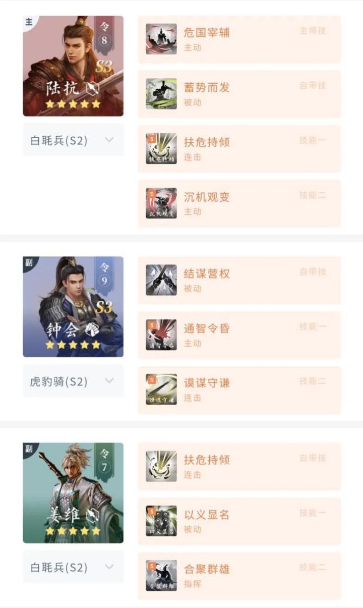 众所周知,具有羁绊关系的武将同时上场,能够激活其对应的羁绊效果,组建强力的羁绊阵容,便可产生1+1+1>3的效果!“桃园结义”、“东吴都督”、“五子良将”等羁绊想必大家并不陌生。S3赛季陆抗、钟会的登场,让“后生可畏”进入了大家的视野范围之内。长江后浪推前浪,“后生们”的实力不容小觑~大神主公现身讲解——后生可畏羁绊队的建队历程,快和小图一起学起来~【阵容推荐】站位:陆抗5-钟会2-姜维3该
