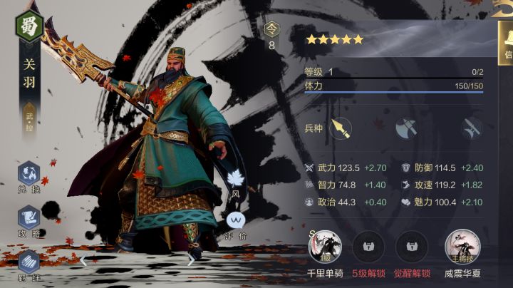 队伍配置关羽+黄月英+主公该配置几乎没有门槛。黄月英和主公属于系统赠送武将,关羽也是首充就可以获得的强力橙卡,技能多以A级和B级为主,无论是兑换还是研究都不会有太大的压力,这个阵容的门槛几乎可以忽略不计。并且该阵容并非一成不变,游戏后期有充足武将后,完全可以将其拆分成更高强度的队伍。 下图是武将携带的技能推荐~武技选择1、关羽:关羽本身属性较高,承伤能力更强,主将技的伤害和效果也很可观,所