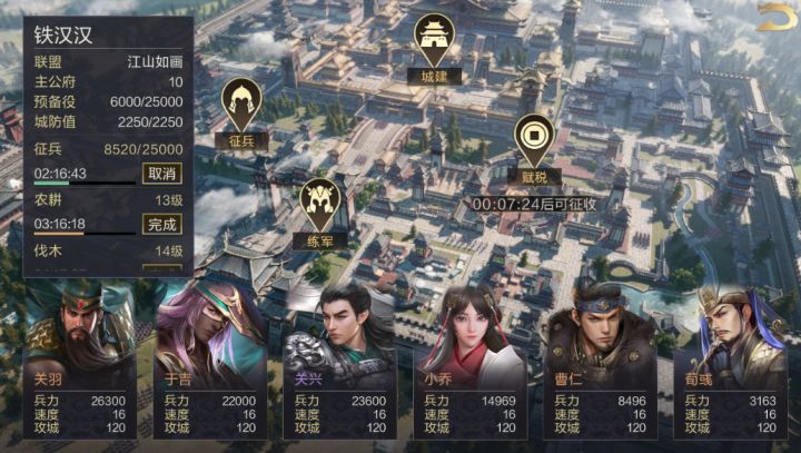 城池建设建设城池是提升物资产量以及资源容量的重要途径之一。在【城建】系统中,主公们可以提升【农耕】、【伐木】、【采石】和【冶铁】的等级,来增加粮草、木材、石料和铁矿的产量。游戏前期非常缺乏石料,小图建议优先提升【采石】~而粮草只有在【征兵】时才会使用,权重相对最低,所以【农耕】前期不必过多升级,够用即可。与此同时,主公们千万不要忘记升级【国库】,增加资源容量,以免资源过剩造成浪费。在军事建筑中,
