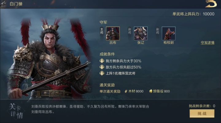 关卡介绍成就星级条件:1.我方剩余兵力大于30%;2.敌方兵力损失超过50% ;3. 上阵1名蜀阵营武将敌方阵容:主将 吕布(骑兵4000兵力),张辽(骑兵4000兵力),骑校尉(骑兵4000兵力)通关奖励:粮草8000 预备役800己方阵容己方单武将上阵兵力:10000基础阵容选择推荐:主将 剧情刘备(步兵),张绣(枪兵),皇甫嵩(枪兵)阵型:方圆阵(敌方主动技较多,阵型减伤)站