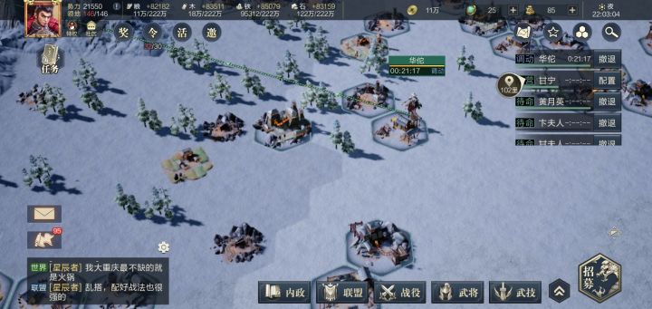 新手玩家进游戏直接做新手任务,跟着任务走就可以,分2个队伍打地,一队和二队体力保持一致。建筑任务不要乱跟着任务升,没有资源奖励的不要着急升,后面会详解。因势力范围和补给的限制,优先打下主城为中心五格内的土地。之后可以自己慢慢用垃圾将攻打低级地块铺路,有比较集中的高级地时,可以立哨塔、要塞。前面1、2级土地随便上2个将拉满兵力就可以打下来,尽量注意野地的武将站位,避免直接击杀了野地主将,保证1