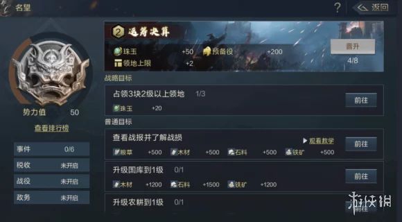 一、武技推荐二、名望任务名望任务相当于新手教程,刚接触鸿图之下的小伙伴可根据名望任务陆续完成。名望任务的奖励包括珠玉、资源、铜币、提升领地上限,都是前期开荒必不可少的。除了快速提名望,前期最重要的是就是占地。三、势力值鸿图之下的势力值相当于RPG手游中的战力,作为衡量玩家实力的一种指标。势力值主要来源于领地势力,攻占领地越高势力值越高,另外建造各种军事建筑、资源建筑也可提升少部分势力值。前