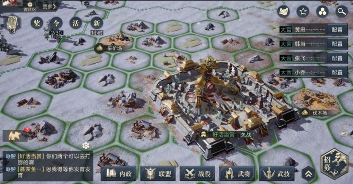 1. 五级资源地攻占细节把主队三个武将全部升级到22级左右,这样勉强能够打下五级资源地,但是会非常大量伤损兵力,这样就得不偿失,建议派一队武将带领1个兵,故意兵败,回看战斗回放,看准敌方主将站位,与之相对,这样主将对主将可以减少战损。1. 攻占三级地略解三级地攻占,首先打开世界地图,查看各三级城距离所有联盟成员主城的距离,找到一个距离最接近三级城的联盟成员,与其沟通让其在三级城附近建立要塞,