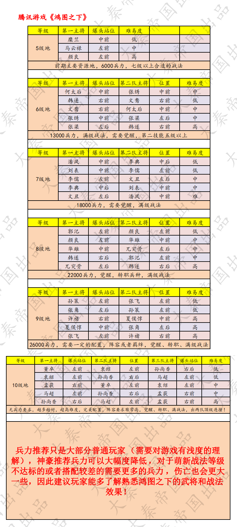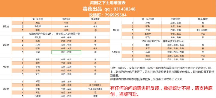 各位新老主公大家好,这里依旧是毒药给各位带来的鸿图干货,今天把付费内测的土地难度全部更新,感谢各位提供数据的大哥,爱你们~————————————————————————————————表格中只出现第一队主将名称,但是多队的主将站位齐全,也有推荐参考的爆头难度,各位主公可以在查阅后再进行土地攻略,记住调整自己的队伍阵型哦,集火主将位置输出,达到爆头效果,减低战损,多队伍主将站位不一时候,建议针