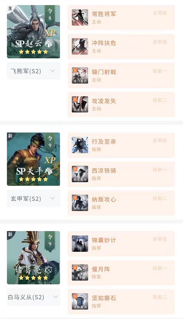 爆头打法虽然高效且致命,但由于站位、目标随机等原因,能真正稳定实现爆头的队伍并不多,而常规爆头队伍一旦站位劣势损失了首轮输出,对后续的战斗会造成较大影响,本期为主公们推荐一个能精准攻击敌方后排的队伍。阵容搭配搭配思路该阵容与上一次推荐的蜀骑不同,该阵容更像S1时期的爆头张飞框架,选定一名属性与自带技能都较出色的武将后,搭配诸葛亮提升技能发动率和生存率,再搭配一名前排承伤或辅助武将。这套体系