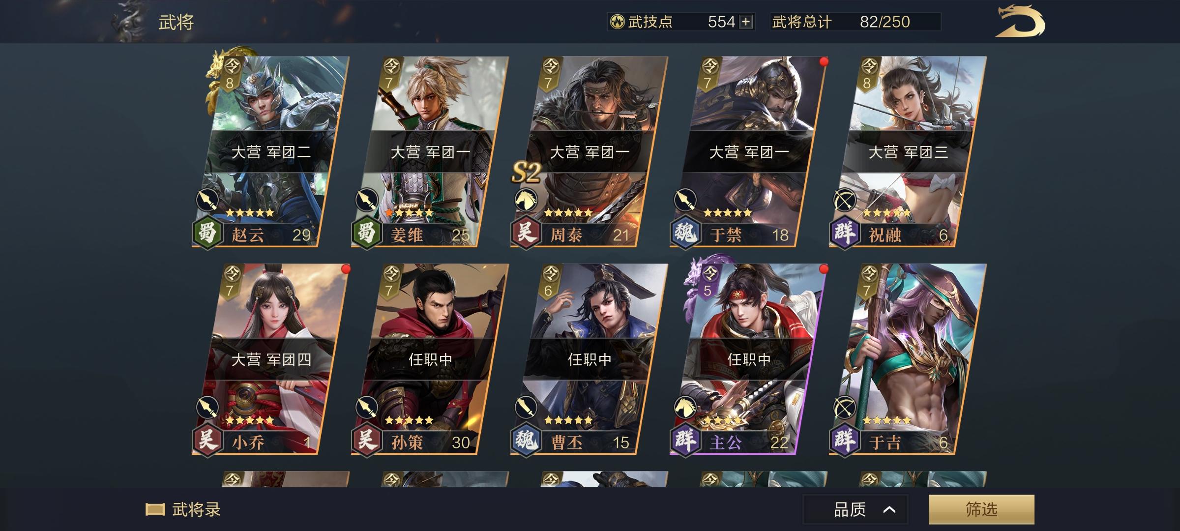 2、抽卡目标提前准备好充值预算,把第一赛季的该花的钱都砸进去(比如预算第一赛季最多充5000,就第一天花5000),直到抽到一套国家队,开始练级,【国家队可以查看武将搭配大全】。 S1开荒,已我的经验来看 ,武力型阵容比较适合,比如桃源、虎卫、三孙,不适合法术型队伍。3、资源分配抽到国家队后,把剩余的珠玉用来转换武技点,蓝卡全部用珠玉转换,紫卡用来学习S卡和A级武技,把开荒的【国家队】配置好