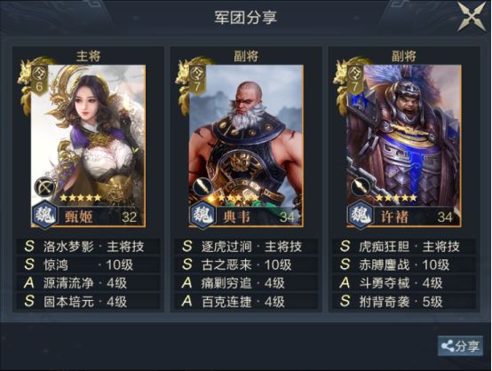 帐前虎卫是大家都所熟知,而在鸿图之下这款SLG中帐前虎卫也是非常强的,但是我们想要完整的抽到曹操、典韦、许褚却是非常的难的,而本次为大家推荐的就是小虎卫,之所以叫小虎卫的原因就是阵容形态相似,寻找其他武将补足缺陷。一、武将搭配甄姬+典韦+许褚我们可以了解到曹操是一个辅助类控制武将,而许褚的自带武技对被控制的武将会有输出加成,而且加成非常的高,可提升50%输出。不仅如此完整的虎卫还有一个羁绊加