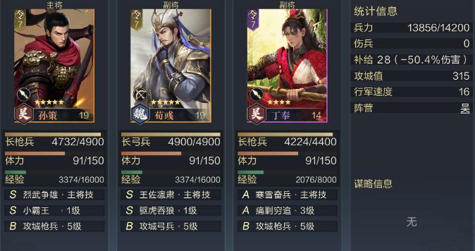 一、攻城技能首先每支队伍的武将尽可能携带攻城技能,尽可能点满(别这么小家子气,咱们已经是小联盟更需要对自己好一点,武将点可以使用钱币召唤低阶武将分解大量获得二、攻城兵种首先前期只有三个兵种有专属的攻城技能(步兵、弓兵、枪兵),排除其他兵种,所以排除最帅气的骑兵。而在三个兵种中推荐的优先级:步兵>枪兵>弓兵,推荐多带步兵(两步一弓是顶好的)。三、武将选择武将选择就比较简单粗暴了,要那种越强