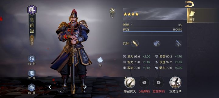 众所周知,鸿图之下里都是五星武将吃香,四星武将往往都是被忽视的, 但是,如果前期没有五星武将(首充关羽、签到武将除外)来加强自己队伍战力,那又有那些四星武将可以一用呢?老任城我来点评一下一、皇甫嵩这可是前期最好抽到的武将之一(良臣勇将),武力攻速都在2.00及以上,武技伤害也挺可观,前期没将用可以用一下。二、黄月英这武将,开局就送,虽然智力比较算低吧,但人家能偷啊,配合主公和一个武力武将,