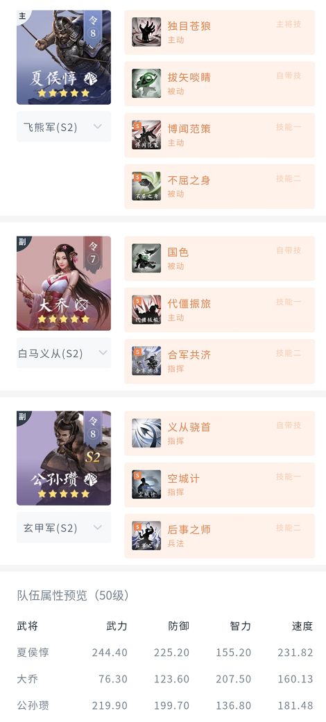 反击流作为鸿图中最特别的体系之一,非常考验主公的配将技巧,大多数反击流都能以低付出获得高收益,比如此前风流一时的碰瓷貂蝉队。本次老将调整中夏侯惇属于获利最大的武将之一,他的新阵容自然成了主公们最期待的消息!这不,小图今天特地为大家带来了夏侯惇的攻略,快一起来看看吧~阵 容 搭 配搭 配 思 路该阵容使用的是保守打法,利用大乔的反制力竭与公孙瓒的闪避,规避夏侯惇所承受的实际伤害。由于夏侯惇的技