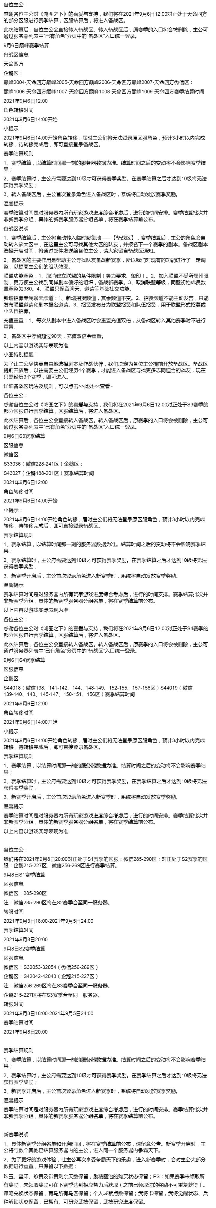 各位主公:感谢各位主公对《鸿图之下》的喜爱与支持,以下公布的是本次赛季分组的区服。9月4日S1赛季分组区服信息企鹅区:242-248区时间节点结算时间:2021年9月1日20:00跨服聊天开启时间:2021年9月1日20:30合服维护时间:2021年9月3日22:30-2021年9月4日10:00维护完成后开启全新赛季新赛季服务器代号企鹅区:跨服聊天开启说明以上服务器将在结
