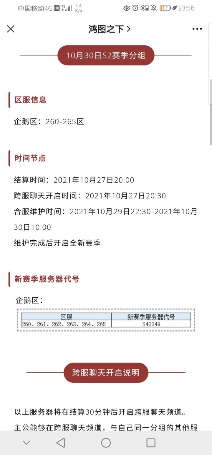 各位主公:感谢各位主公对《鸿图之下》的喜爱与支持,我们将在2021年11月29日12:00对正处于赛季服的部分区服进行赛季结算,区服结算后,将进入备战区。11月29日巅峰赛季结算备战区信息官渡之战企鹅区:巅峰2029-官渡之战巅峰2030-官渡之战微信区:巅峰1037-官渡之战巅峰1038-官渡之战赛季结算时间2021年11月29日12:00角色转移时间2021年11月