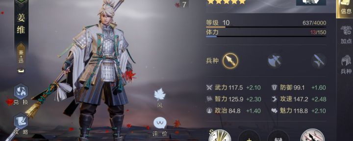 鸿图之下中,姜维属于吞并输出本领以及帮助本领的武将,而且它的智力加成就有2.3,其的主将技能为“智勇双全”对分为内的敌军共造成武力伤害95%、智力伤害95%,技能冷却20秒。除此之外,还可以携带技能毒矢齐射和鸠弑。需要注意的是,姜维的可兑换武技“扶危持倾”在普攻时,额外对普攻的目标造成150%的智力伤害,并且对自身恢复的兵力(恢复率为150%,受智力影响)。武将搭配推荐主将,姜维+张辽+徐晃。