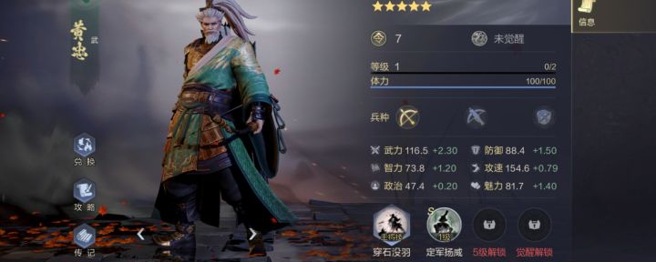 鸿图之下中,黄忠带的技能分别是,S级主动技“穿石没羽”,使用时可以对范围内的敌方武将,造成80%的武力伤害,并对其施加溃散,持续时间是20秒;S级主动技“定军扬威”,发动概率是60%;攻击处于崩溃状态的对手,伤害增加50%。另外可以兑换技能S级被动技“枕戈待旦”发动概率是100%,技能携带者每释放一次主动技能,可以使武力伤害提高20%(最高叠加5次),持续全场。需要注意的是,“枕戈待旦”是鸿图