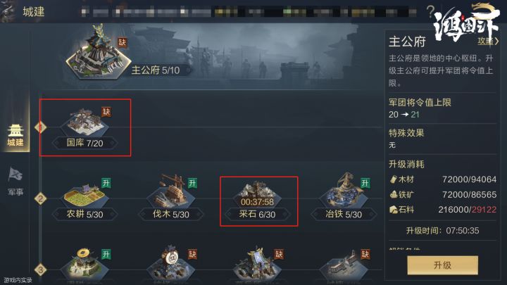 各位主公好,小图又来助力开荒啦~《鸿图之下》上线第6天,大家游戏进行的如何?依然在累积资源吗?粮草、石料、木材、铁矿还够用吗?小图相信在游戏初期,主公们难免会遇到资源短缺的情况,今天,便献上3条计策,帮大家轻松解决这个问题~第一计:城池建设主公们升级【城建】了吗?建设城池是提升物资产量以及资源容量的重要途径之一。在【城建】系统中,主公们可以提升【农耕】、【伐木】、【采石】和【冶铁】的等级,来