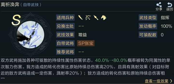 本次新武将中最受瞩目的便是SP张宝,拥有着转换持续伤害能力的他,似乎在预示着持续伤害作为前置工具的时代已经结束,由属性伤害搭建的新机制队伍即将诞生,为了让主公们对他有更充分的认识和准备,本期小图将带领大家一同探究他的机制!01、技能优势优势一:状态清除,封锁联动离析涣奔的效果会同时作用于双方,这对于我方而言属于绝对优势,因为在实战中当持续状态被转换为即时伤害后,对应的负面状态会被清除,而敌方