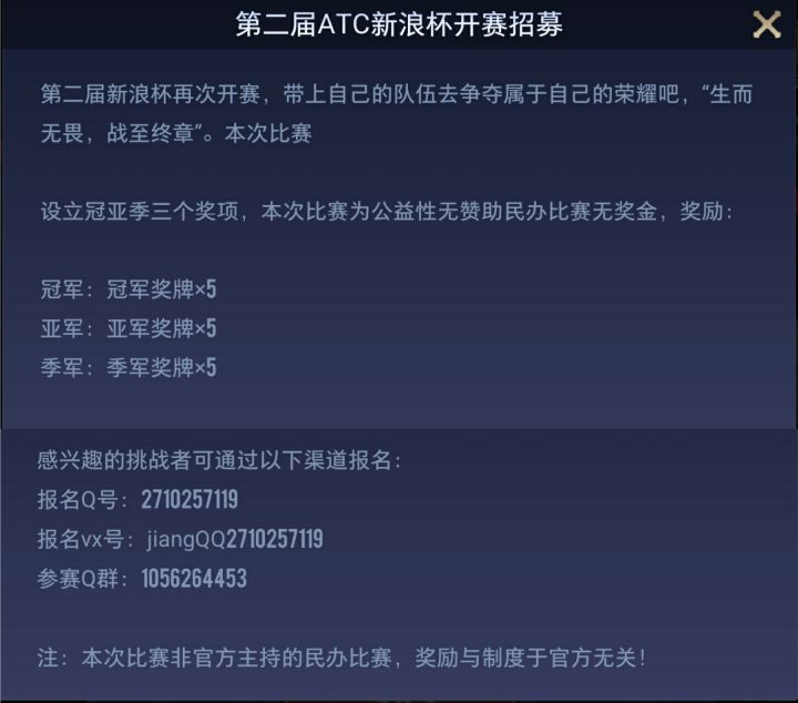 一、第二届ATC新浪杯开赛招募第二届新浪杯再次开赛,带上自己的队伍去争夺属于自己的荣耀吧,“生而无畏,战至终章”。本次比赛设立冠亚季三个奖项,本次比赛为公益性无赞助民办比赛无奖金。奖励:冠军:冠军奖牌×5亚军:亚军奖牌×5季军:季军奖牌×5感兴趣的挑战者可通过以下渠道报名:报名Q号:2710257119参赛Q群:1056264453注:本次比赛非官方主持的民办比赛,奖励与制度于官