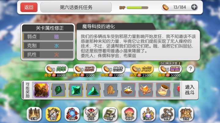 1.尽快通过英灵试炼大师难度:如果没有通过这应该是每一位玩家最优先考虑的事情,大师难度UR碎片有概率一次掉落两个,平均一天三个,相对于困难模式25天刷一张UR券现在只需17天左右!其他材料掉落概率也高。打大师难度要通关噩梦6-5,就是委托任务6-A大师难度那关同样弱暗克水抗火,大家如果不熟悉boss技能可以拿他练手(快打赢了退出就行),所以如果大家主力是暗队那么这关会相对容易一些。通过战力,