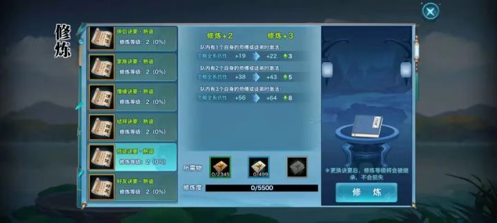 更新后阵法系统分为三层,外层是旧版阵法系统内的六本关系诀要,中层为新增的五行诀要,内层为新增的阵法诀要。诀要升级需要消耗阵法修炼道具:阵法修炼精要+500修炼度、阵法修炼残卷+100修炼度。一、关系诀要⭐️等级需求⭐️1阶关系诀要等级需求为80级,2阶关系诀要等级需求为90级。⭐️分类⭐️好友诀要、结拜诀要、家族诀要、侠侣诀要、情缘诀要、师徒诀要。这六本诀要沿袭了上个版本阵法系统的生效