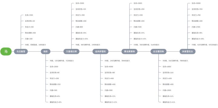 看到有人问坐骑升阶的问题,还是看了一眼就无视了(实在懒得回答问题哈哈哈),老规矩,我来发帖解答~先放一个总览图,可能传上去也就不怎么清晰了(大概),想要这个图的小可爱可以私信来问我要图。下面来分开展示一下各个阶段的坐骑属性以及升阶要求。一、乌云踏雪首先是【乌云踏雪】,这是最基础的升阶马,可以通过攻城战拍卖获取,价格是6000元宝,等级要求50级。二、绝影然后通过120个马牌,可以将【乌