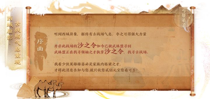 前几天公布了新资料片【远征天脉】的概念爆料,少侠们是不是都充满了期待呢?小师妹最近可是一刻都没停下,专心为少侠们准备超多看点的资料片爆料!近日江湖热议不断,传说中的【沙之令】应该如何获取?今天就让小师妹来给你答案!还有天下会武冠军邀请赛赛程公布,一起下滑看看吧~远征先锋评选明日开启赢专属称号,共享沙之令宝藏古之战场,静候君临。少侠想要获取【沙之令】,开启西域古战场探得稀世宝藏吗?那么这场远
