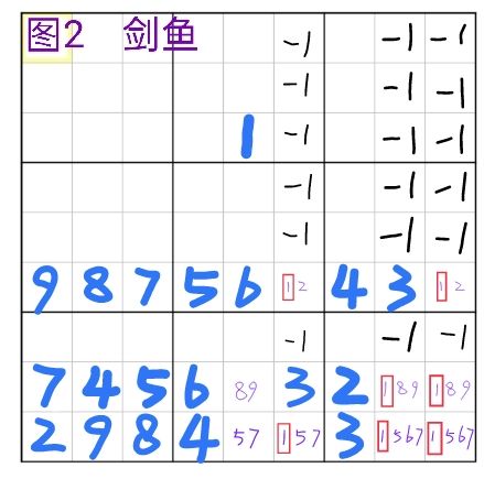 鱼(链列)一种结构的称呼,它跟数组很类似但又不太相同,鱼的逻辑是n个数字a刚好填入且只能填入n行n列时,这个结构形成稳定,那么在结构以外的区域不能再填入数字a,否则结构内数字a会填不满导致无解。其中,决定鱼结构的行/列叫做定义域,鱼的结构涉及到所有单元格叫做鱼身,鱼结构成立后能删除数字的区域叫做删除域。定义域如果是行,那么删除域就是列,反之亦然,当然也有宫内的删数格,这是鱼的扩展,不会出现在这个篇