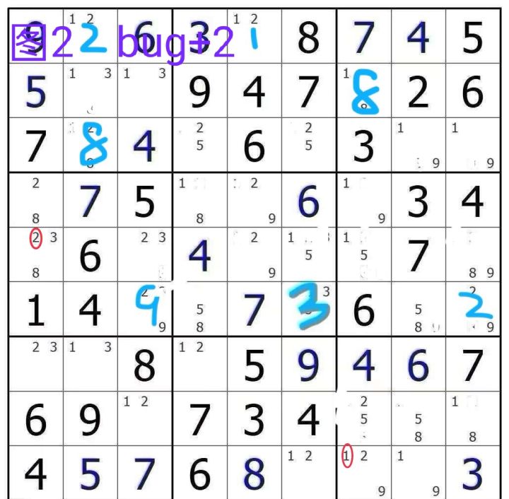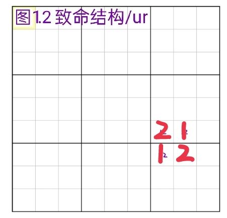 本单元要讨论的是基于致命结构来解题的另一种技巧,bug+1(双全值坟墓)。ur结构是在两宫/两行/两列达到稳定构成的致命,而bug+1涉及到的是全盘所有的候选数。先说说bug+1的构造,全盘候选数只有一个三值格(三个候选数),剩下的单元格都是双值格,而且三值格中的某个数字a在三值格所在的行列宫都各出现3次,那么这个结构就是bug+1。(如果三值格有两个,两个三值格中分别有数字a跟数字b都各出现3