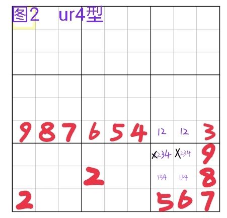 图1是ur3型。观察可发现r6c78只有候选数12,r7c7只有候选数124,r7c8只有候选数123,r7c6有个34的双值格。我们来分析一下,r7c7的4跟r7c8的3如果同时为假,r67c78就会形成12致命,所以它们不能同时为假,如果同时为真,r7c6就无数可填,所以它们也不能同时为真,只能一假一真,这就跟r7c6形成了类似数对的结构,(无论结构内3/4哪个为真,r7c6都会出现另一个数)