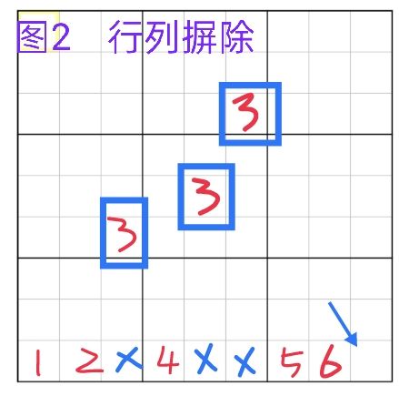 摒除法又分为行列摒除跟宫摒除,其中因为宫的视角比较集中,所以相对于行列摒除来说,宫摒除更容易被看到,图1就是一个宫摒除出数的例子。行列的视角更宽广,会相对于宫来说更不容易看到,图2为行列摒除出数的例子。区块跟摒除的例子,在之后的区块里再讲解。-------------------------唯余法因为涉及到的数字比较多,所以相对于摒除来说,会更难观察到,图3为唯余出数的例子,唯余一般也只有在出