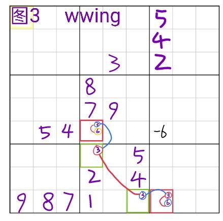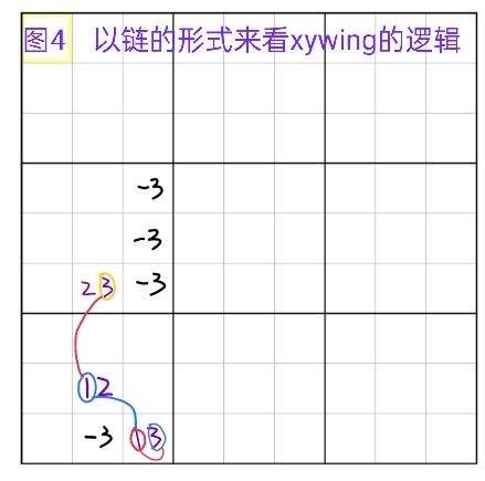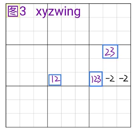 关于涉及到的各种名词详看①。xywing是一种结构,结构形式为候选数分别只有ab/bc/ac的三个单元格,以ab为中心,bc跟ac分别跟ab有交集,删数格为bc跟ac的共同作用格的c,删数逻辑是当共同作用格c为真时,中心格ab无解。图2中的蓝框为xywing的例子,r68c2,r9c3的三个格子构成了23/12/13的xywing(r8c2为中心格,r6c2与中心格同在c2,r9c3与中心格同