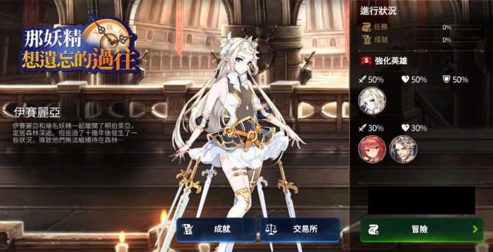 1. 支线故事'那妖精想遗忘的过往'开跑伊赛丽亚和几名妖精一起离开了桐伯莱亚,定居森林深处。但是过了十几年后发生了一些状况,导致他们无法继续待在森林…进行期间台湾时间3/26 (周四) 11:00 ~ 4/9 (周四) 10:59入场条件账号等级达到9以上可在大厅中的'战斗'图示中入场。进行方法'那妖精想遗忘的过往'是为期两周的支线故事。可在支线故事专属关卡、任务、成就、等搜集活