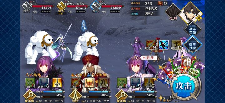 第一面孔明全开,陈宫炸,回19%。(黑呆加攻也可第一面开)第二面梅林13,3技能给黑呆,换CBA放23,3技能给陈宫,陈宫开2补正100,黑呆开3加攻(第一面开了就跳过),衣服加攻,起爆。第三面莎翁13给黑呆补满,陈宫3给黑呆,黑呆开1,收尾3T。每个人BOX不一样,伤害也有浮动,自行修改,有棉被小莫COST不够就把莎翁换玛修,反正有自充,礼装满破也可以把莎翁换其他。