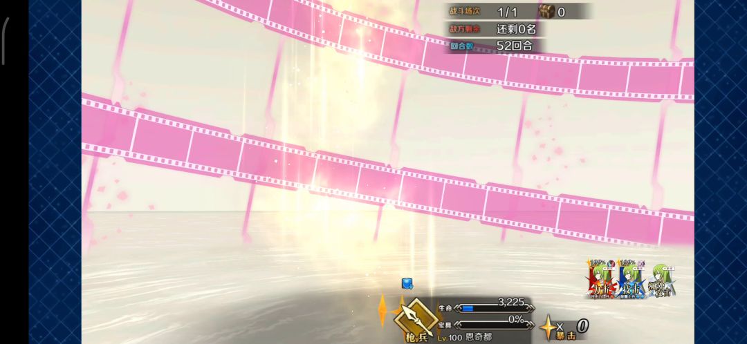 坐标——闭幕5-3杀生院剧情杀,这里触发剧情杀的条件是杀生院放宝具,所以只要她放不出宝具就能继续打下去了。配队如下(思路其实是来自于去年NGA看到的帖子),这个打法也适用于正常的大菩萨。(图补上了,实际上1宝+2宝足够了)需要三令咒启动,图中有一个梅林带满破虚数是因为我只剩两划令咒了,实际上三令咒启动配宇宙棱镜更稳定。(PS.如果正常的大菩萨,前排放三个炮灰,带NP礼装启动就不需要令咒了)幼