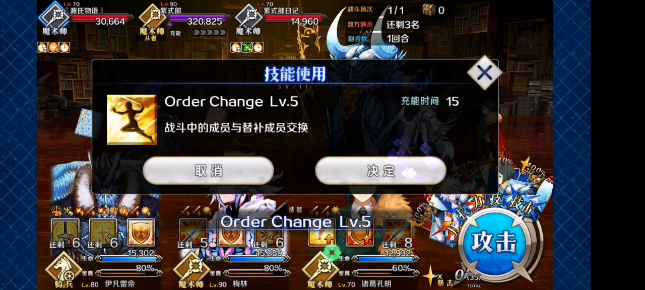 因为无令咒3T需要百级满芙芙长江加神仙发牌,我实在没有耐心(狗头)所以把宝石换成了黑杯,敷衍一下一令咒3T完事,途中还被朋友电话骚扰,请不要在意(滑稽)阵容,黑杯长江20星礼装CBA,20星孔明四号,老板娘花嫁5号,换人衣服