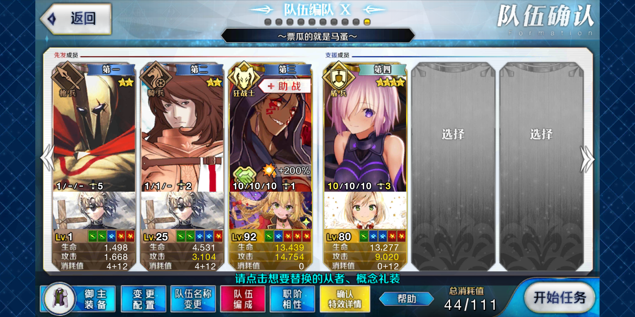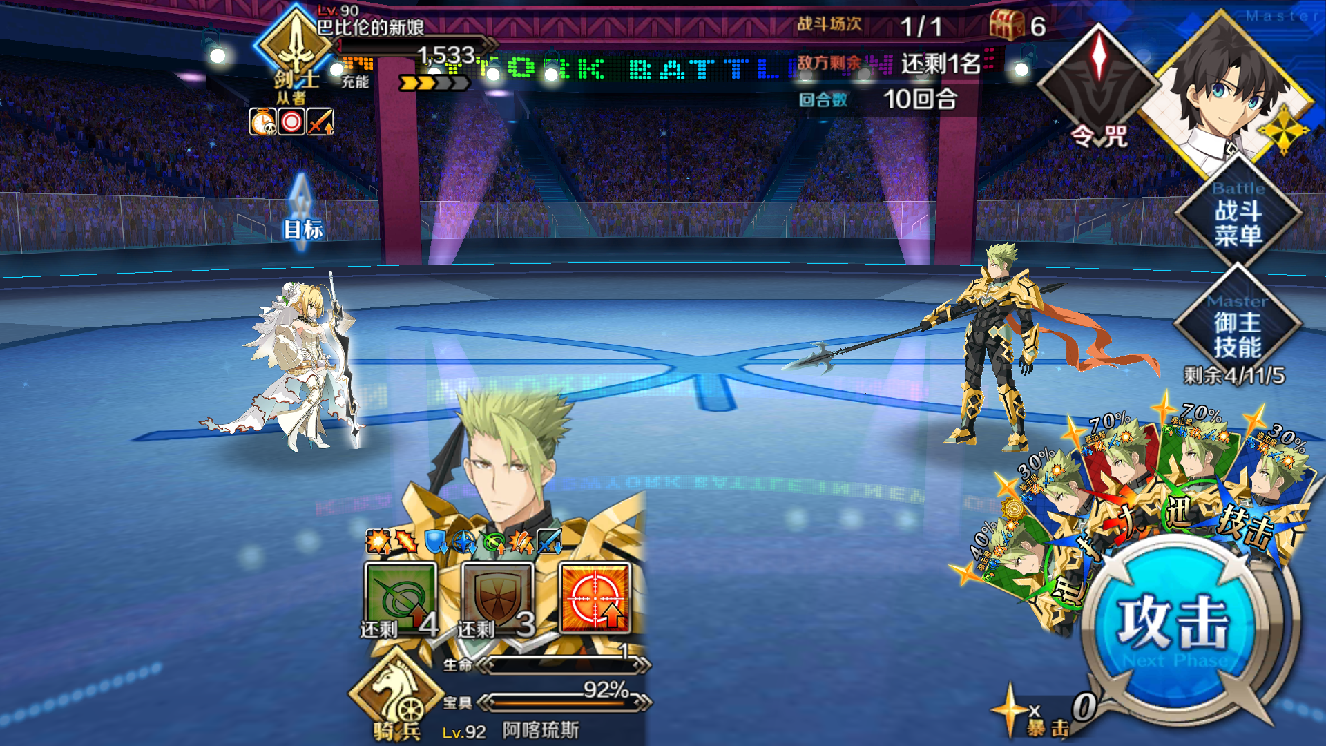 随便打的,用了一道咒令思路就是嫖个输出,最后一人带群攻前面一直卖,别打花嫁,剩最后3个的时候上脚后跟直接令咒充满然后战续单挑