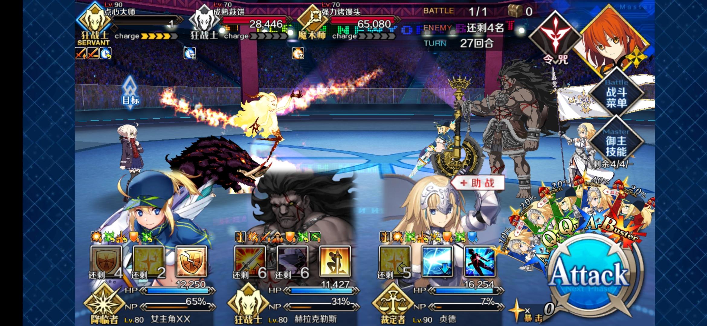 打了27次,第28次可算是成功了,个人感觉最难得副本了。膀胱队,前排打手贞德梅林,而且必须用打手把60万血的脚神给干死(不然解除一个buff打起来会很难受,加血加不上,无敌被解除,总之只要打手把脚神给干掉后面会很舒服),脚神死后拉CBA,然后就突出一个用脚打,看BXbuff不是很多可以赌不开宝具和无敌,buff多必须CBA或者梅林无敌,白贞宝具加上,总之就是CBA白贞必须尽快的攒宝具宝具,以防万