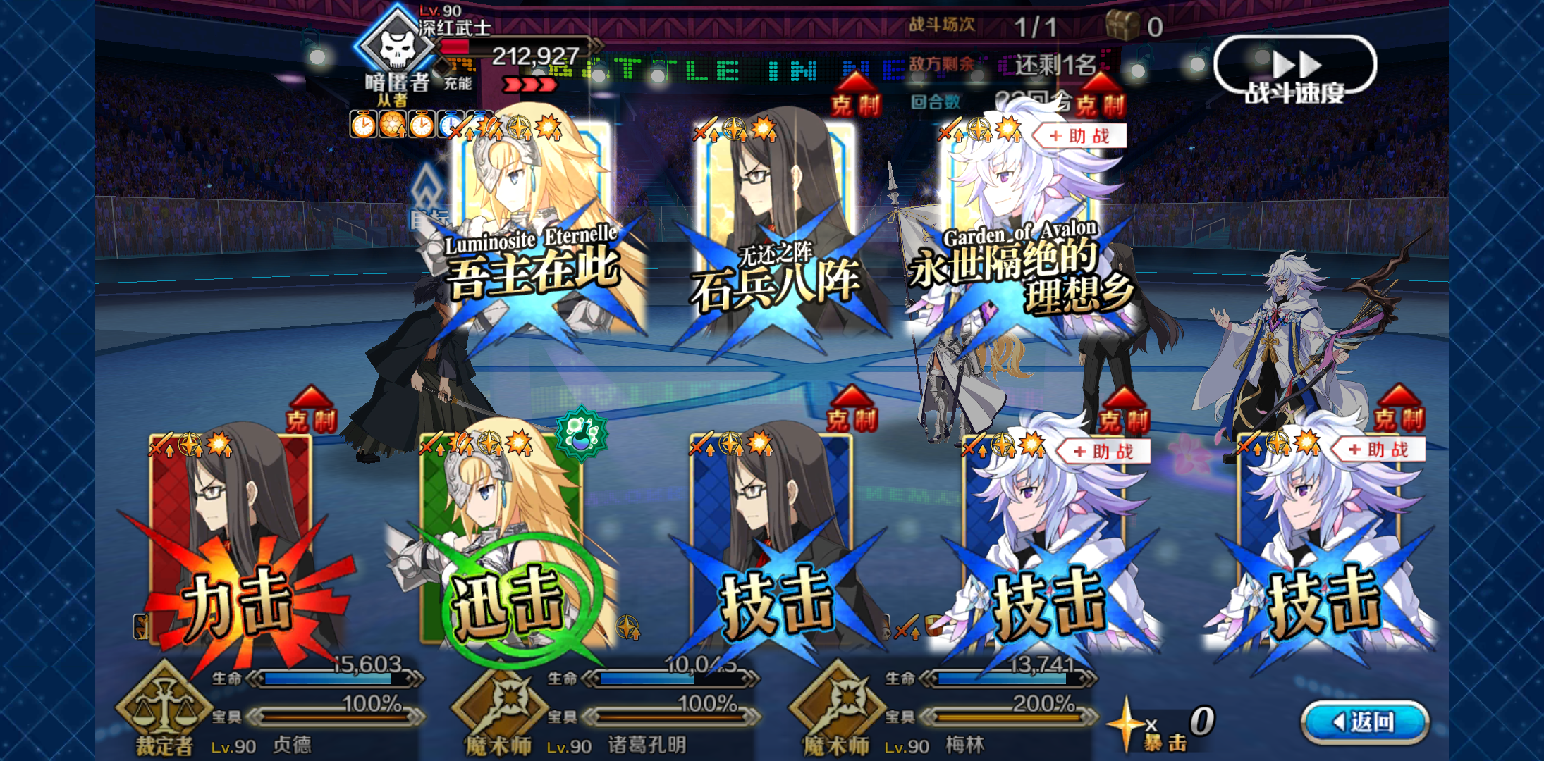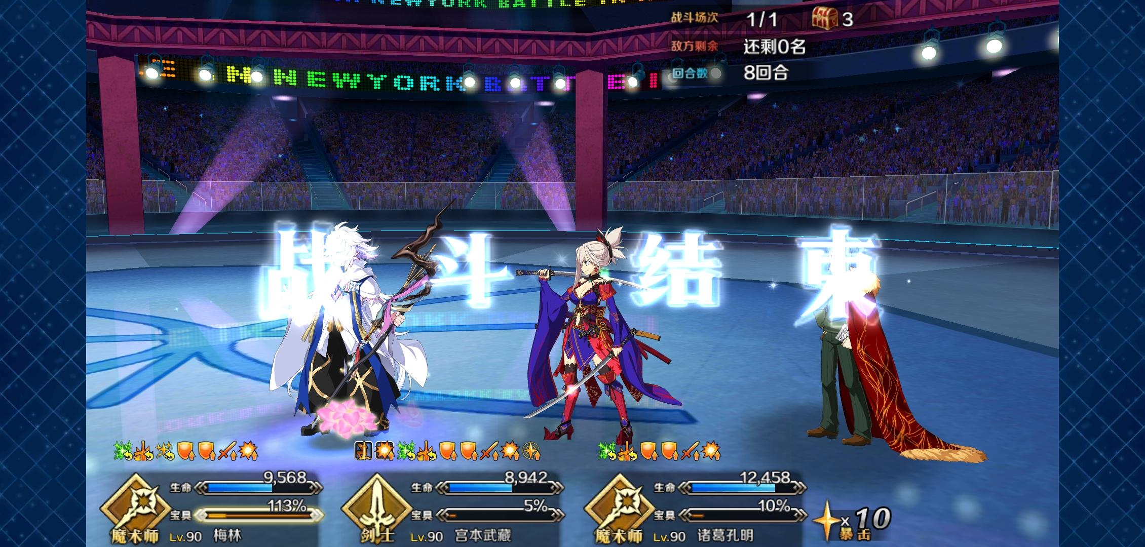 三画令咒全被收走了,嫖了个孔明,buff令咒全给了狂,只是一宝狂兰伤害有点不够,大王丝血反杀。😂