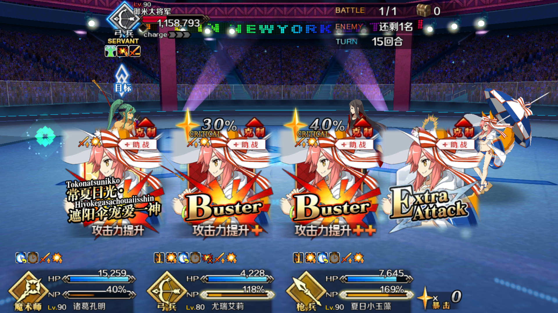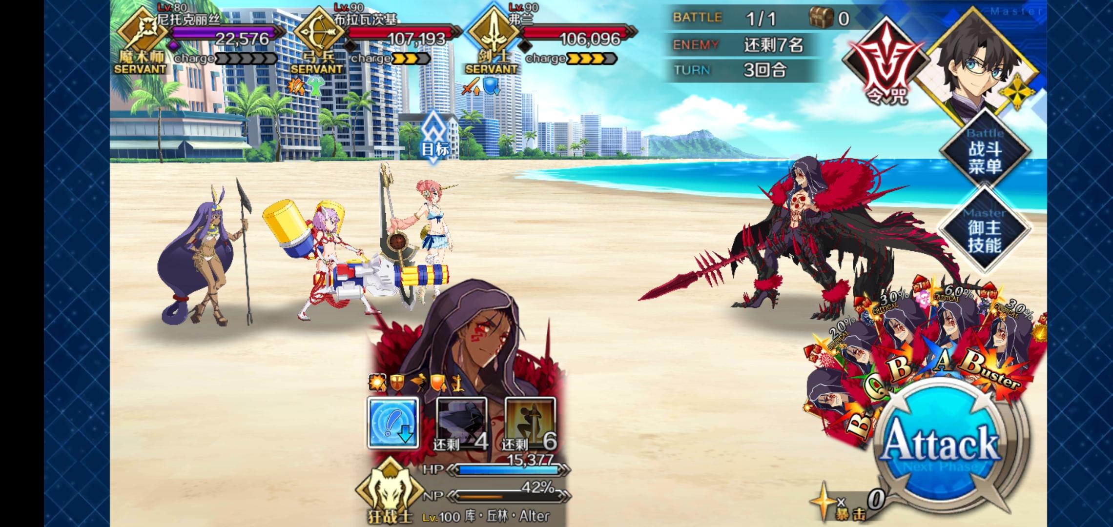 这一关基本属于白给高难,用有保命技能的枪单体单挑就能过。我第一次打脸比较黑,表藤太把饭团几乎全扔给紫发老……婆了,消化饭团后的宝威加攻我安娜几乎没吃到。重新打果断让cba早点下场,直接进入单挑模式。虽然每回合会减ho上限,但是对面用红卡攻击时会给你加血。配合倍卡打这关基本没压力,安娜,宝具把送米工控的死死的