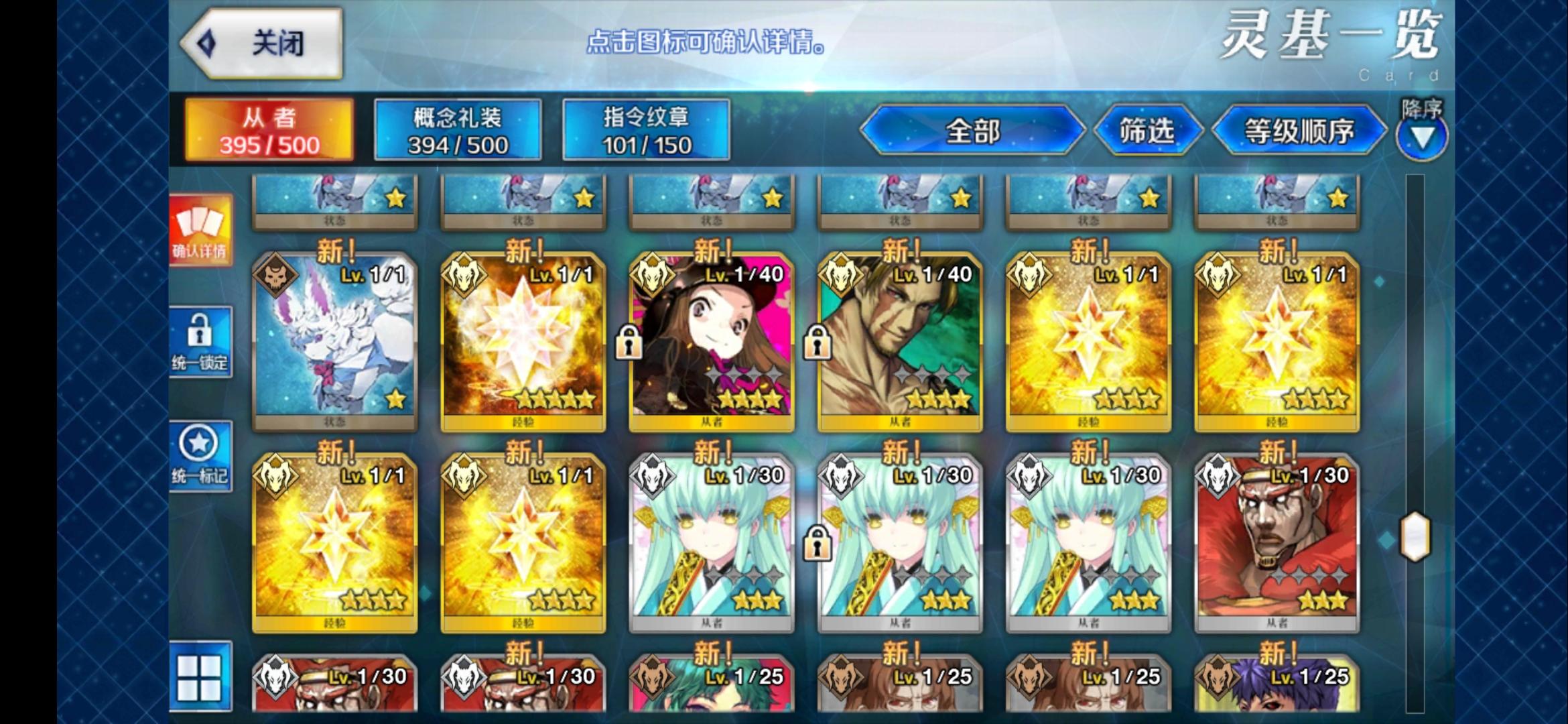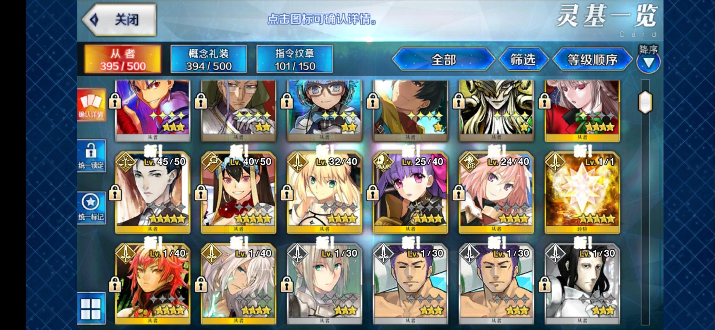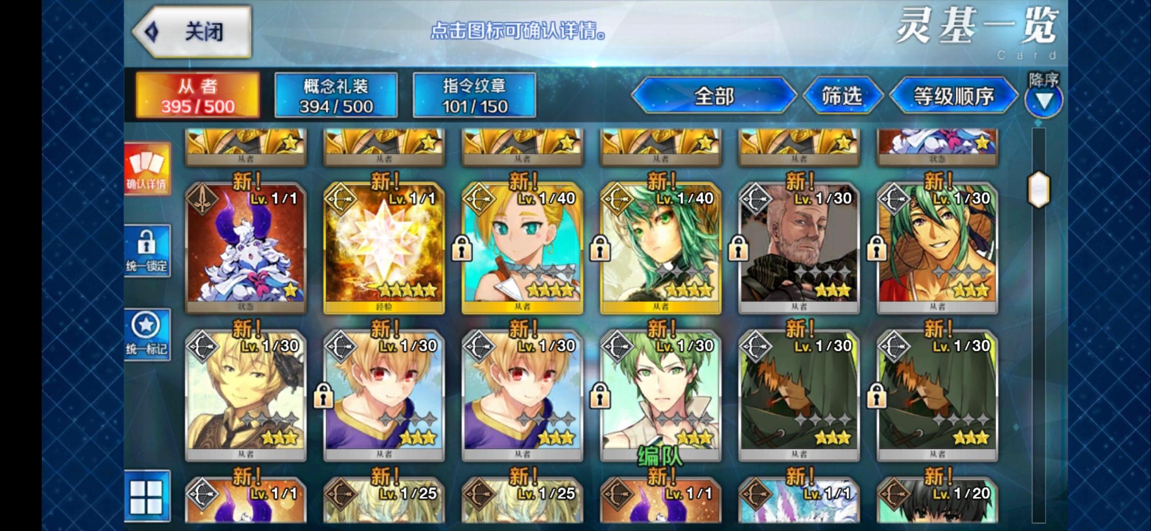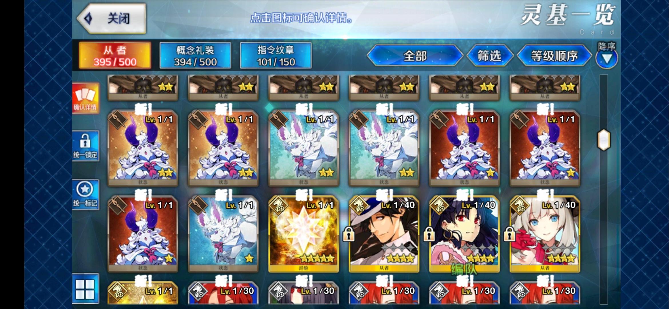 自建号的纪念一开始因为看了fate而选择了入坑,大概是机械龙娘那个时候,yssy,前期没有拐的生活真的贼悲催😭,但运气应该还行,为cba攒了好久的石头,沉了后退坑了一段时间,后面60石梅林又燃起希望,为cba再次攒了一次,结果可能我和那位慈祥的老者相性不加导致又沉了,宇宙凛那个活动我特么又退了,现在又贼后悔,我真是对这游戏又爱又恨啊。