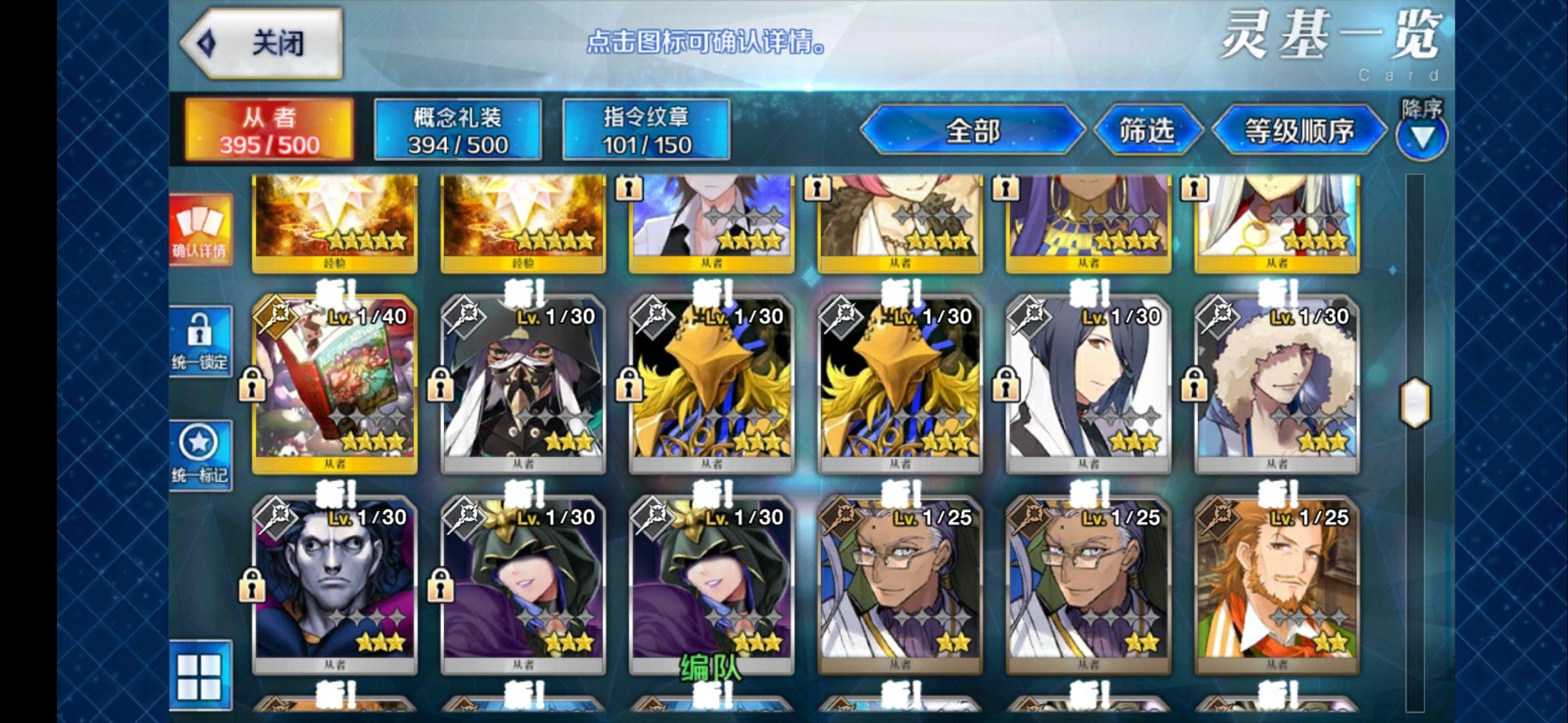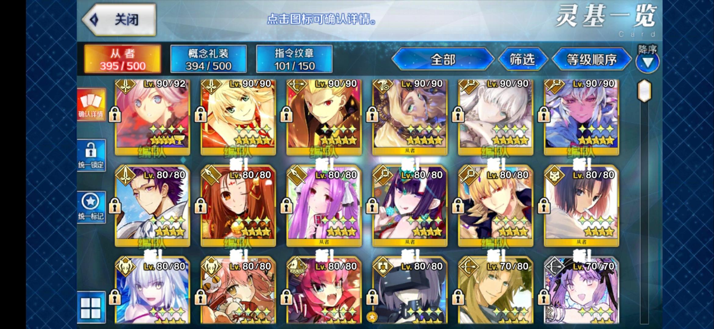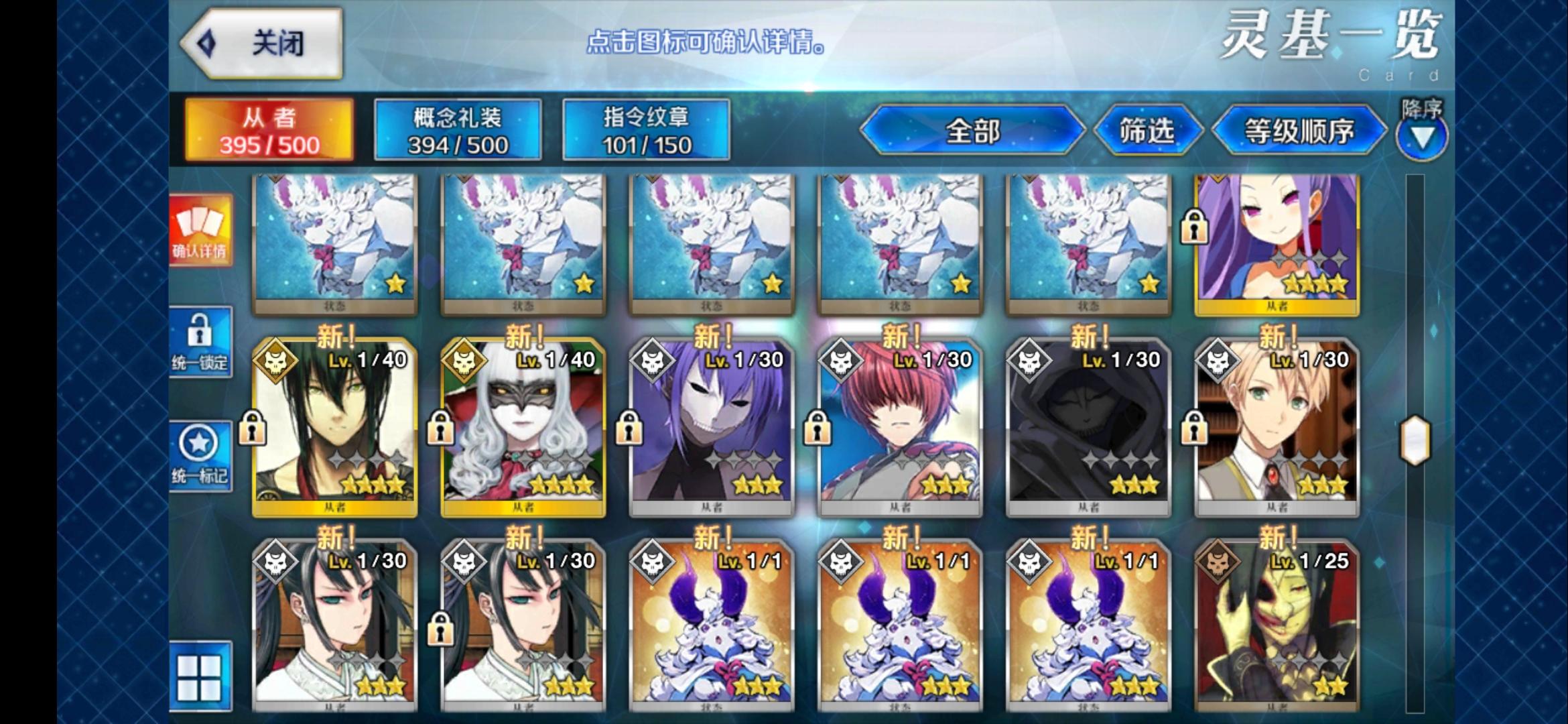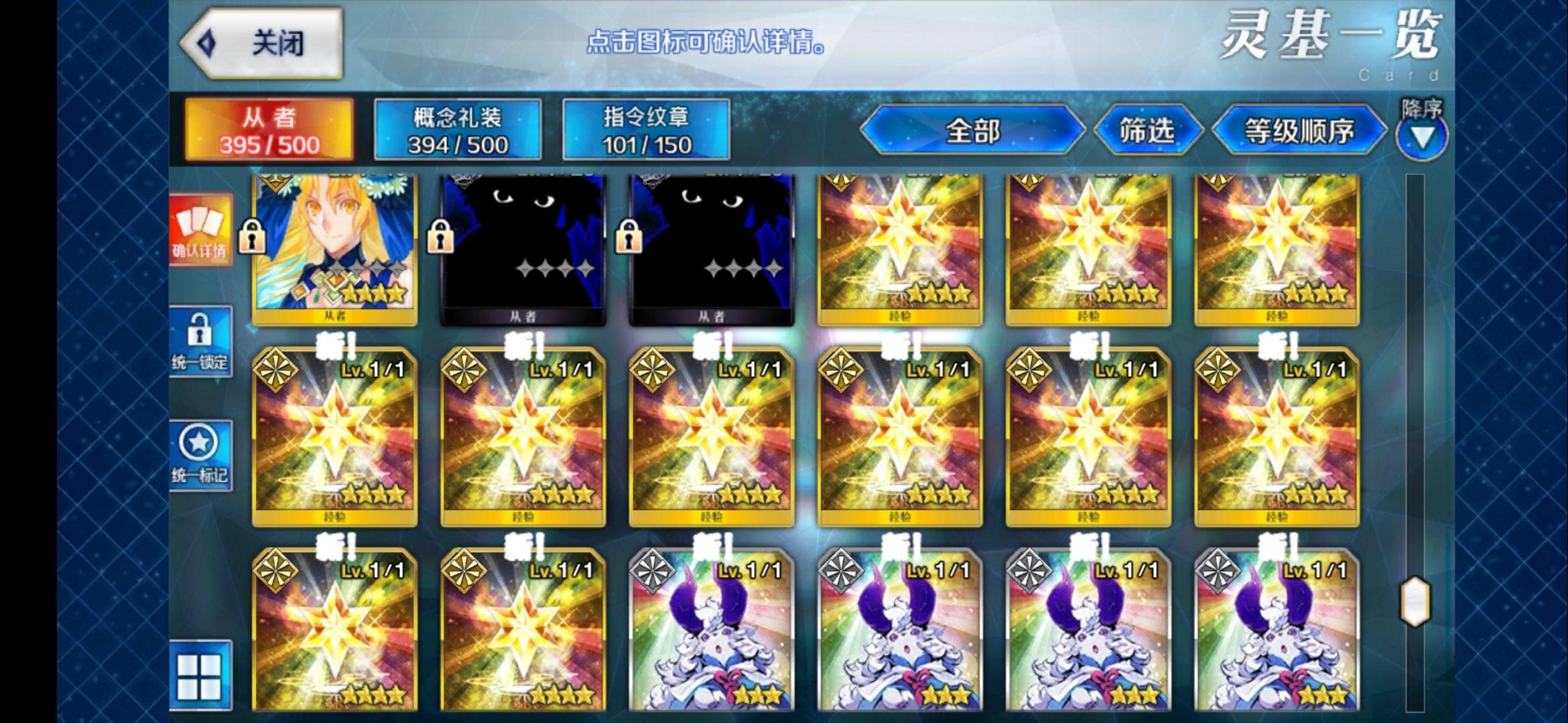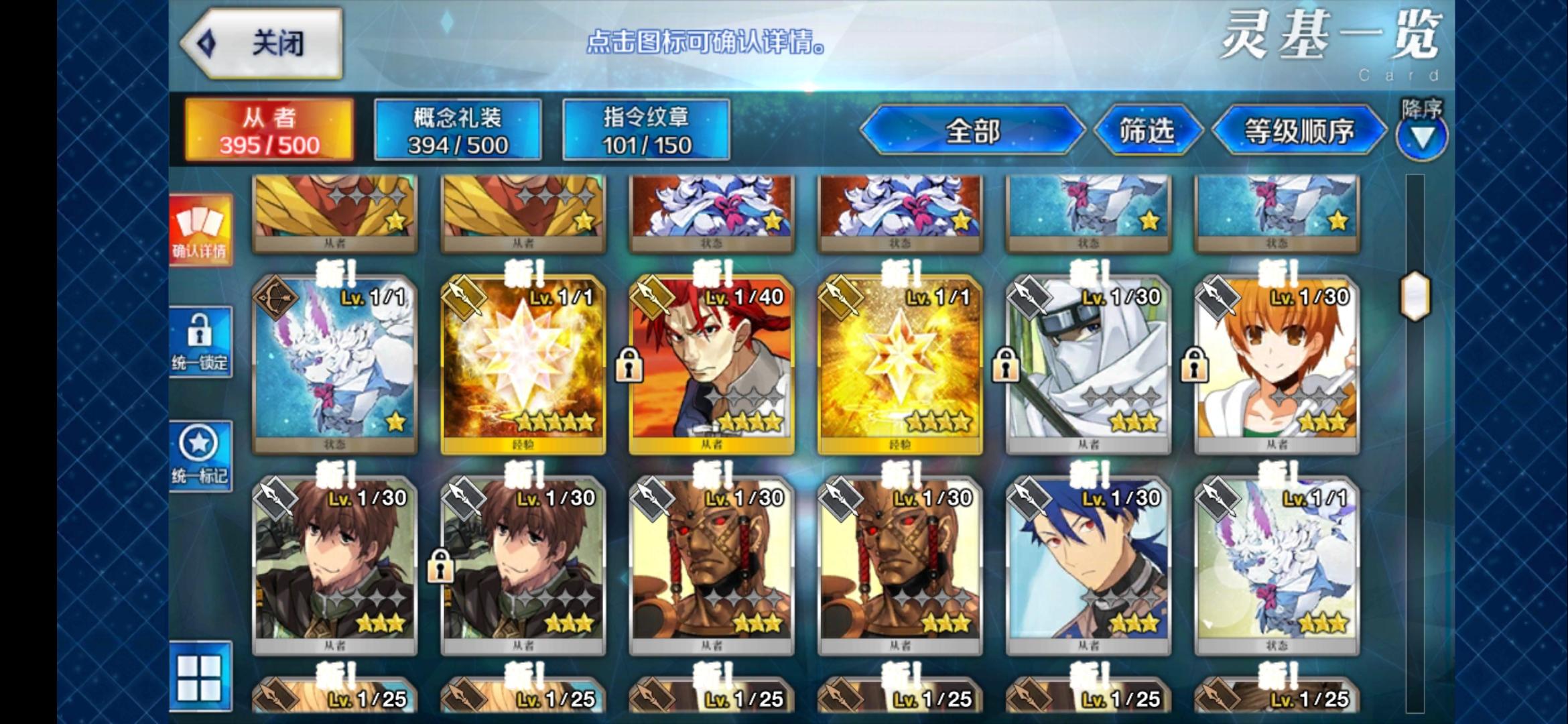 自建号的纪念一开始因为看了fate而选择了入坑,大概是机械龙娘那个时候,yssy,前期没有拐的生活真的贼悲催😭,但运气应该还行,为cba攒了好久的石头,沉了后退坑了一段时间,后面60石梅林又燃起希望,为cba再次攒了一次,结果可能我和那位慈祥的老者相性不加导致又沉了,宇宙凛那个活动我特么又退了,现在又贼后悔,我真是对这游戏又爱又恨啊。