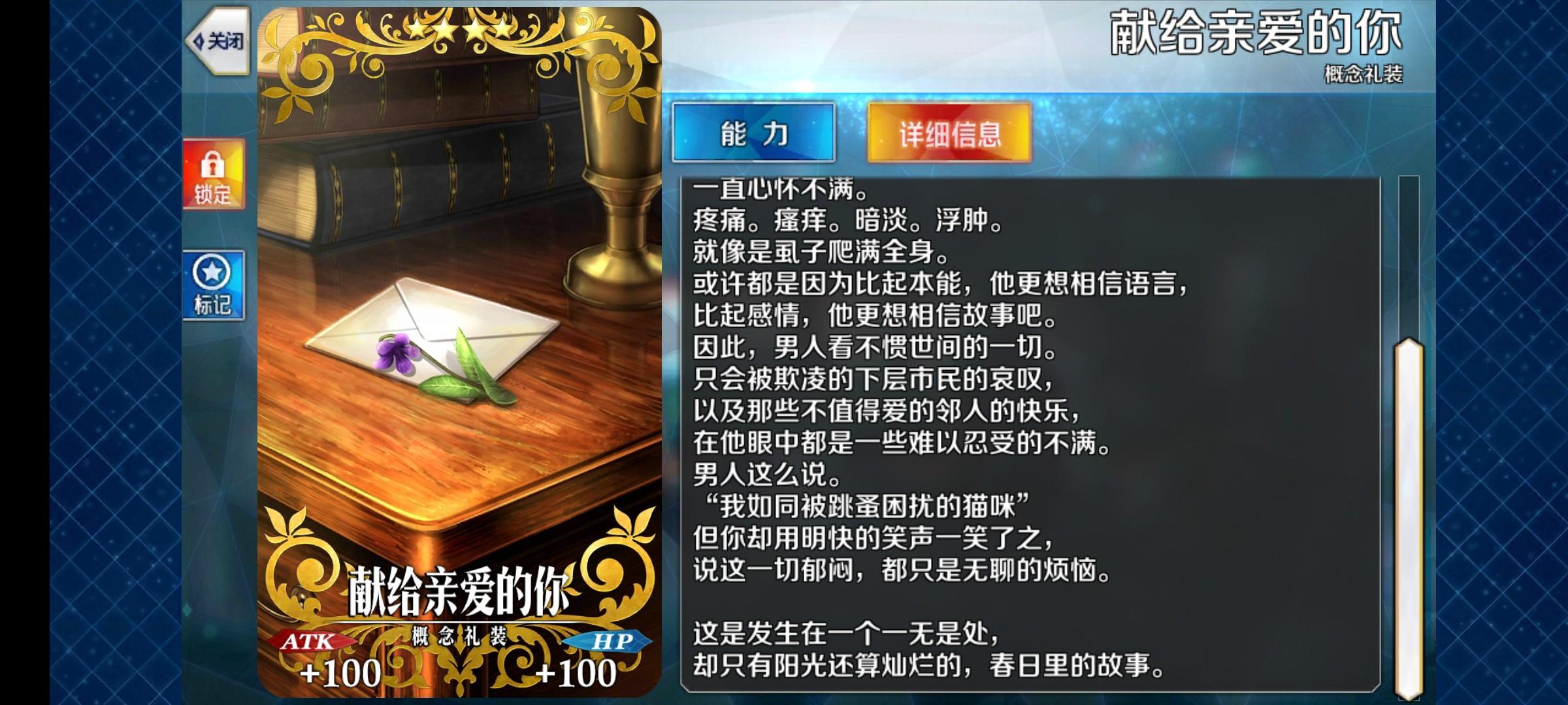 感谢这次给的圣杯,终于把莫崽百级了冲莫的游戏内个人资料6中写到:“冲浪小莫在夏日精力充沛,秋天低落,冬天陷入谷底。所以御主请务必在秋冬季节耐心十足地陪伴她。她迟早会发现,通往夏日的门扉始终在自己的身边。”还有个人空间内语音“讨厌的东西”:“讨厌的东西是……冬天吧。就算冬天到来,偶尔也要用我哦,御主?”这点!当然啦!毕竟咱也是个厨子,她冲起来实在太棒了(划掉顺便再提一下冲莫的羁绊礼装解说