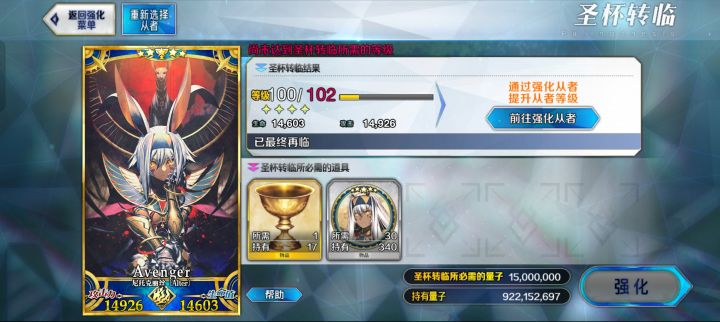 这次更新送了100多个金芙芙,我的公主终于可以喂满了(之前差五个)。这下公主是我第一个120级、五宝、拉满金芙芙的五星从者了。#fgo #命运冠位指定 #fgob服