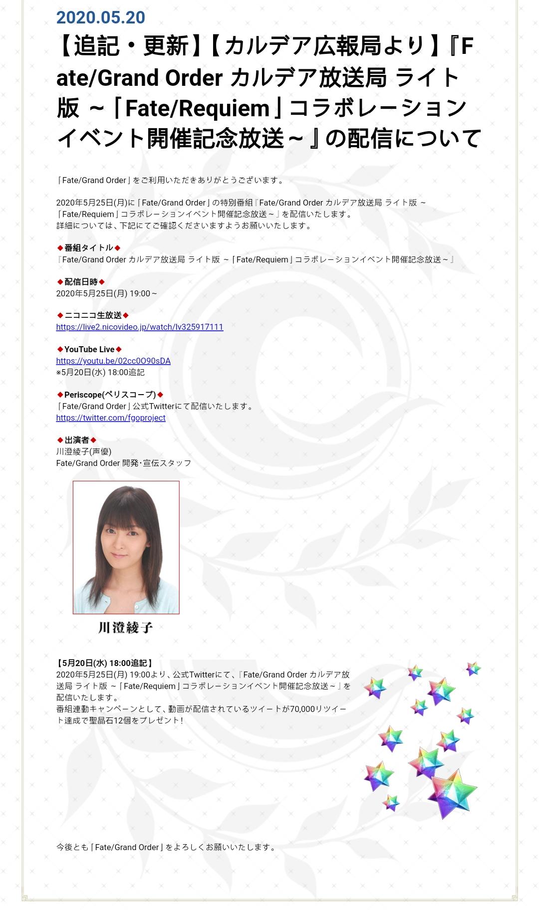 Fate/Grand Order 迦勒底放送局 轻量版 ~[Fate/Requiem]联动活动举办纪念放送~生放送时间:5月25日(周一) 18:00(北京时间)生放送地址:B站转播地址:活动嘉宾:川澄绫子(声优)、Fate/Grand Order 开发·宣传Staff.7万转推达成,赠送12颗圣晶石.