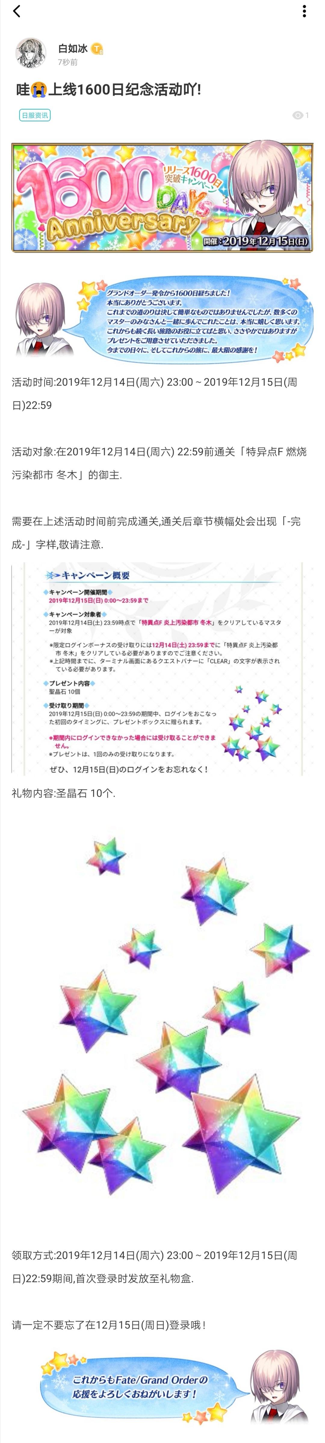 活动时间:12月14日23:00~12月15日22:59活动对象:在2019年12月14日22:59前通关「特异点F 燃烧污染都市 冬木」的御主.需要在上述活动时间前完成通关,通关后章节横幅处会出现「完成」字样,敬请注意.礼物内容:圣晶石十个.领取方式:12月14日23:00~12月15日22:59期间,首次登录时发放至礼物盒.请一定不要忘了在12月15日登录哦!