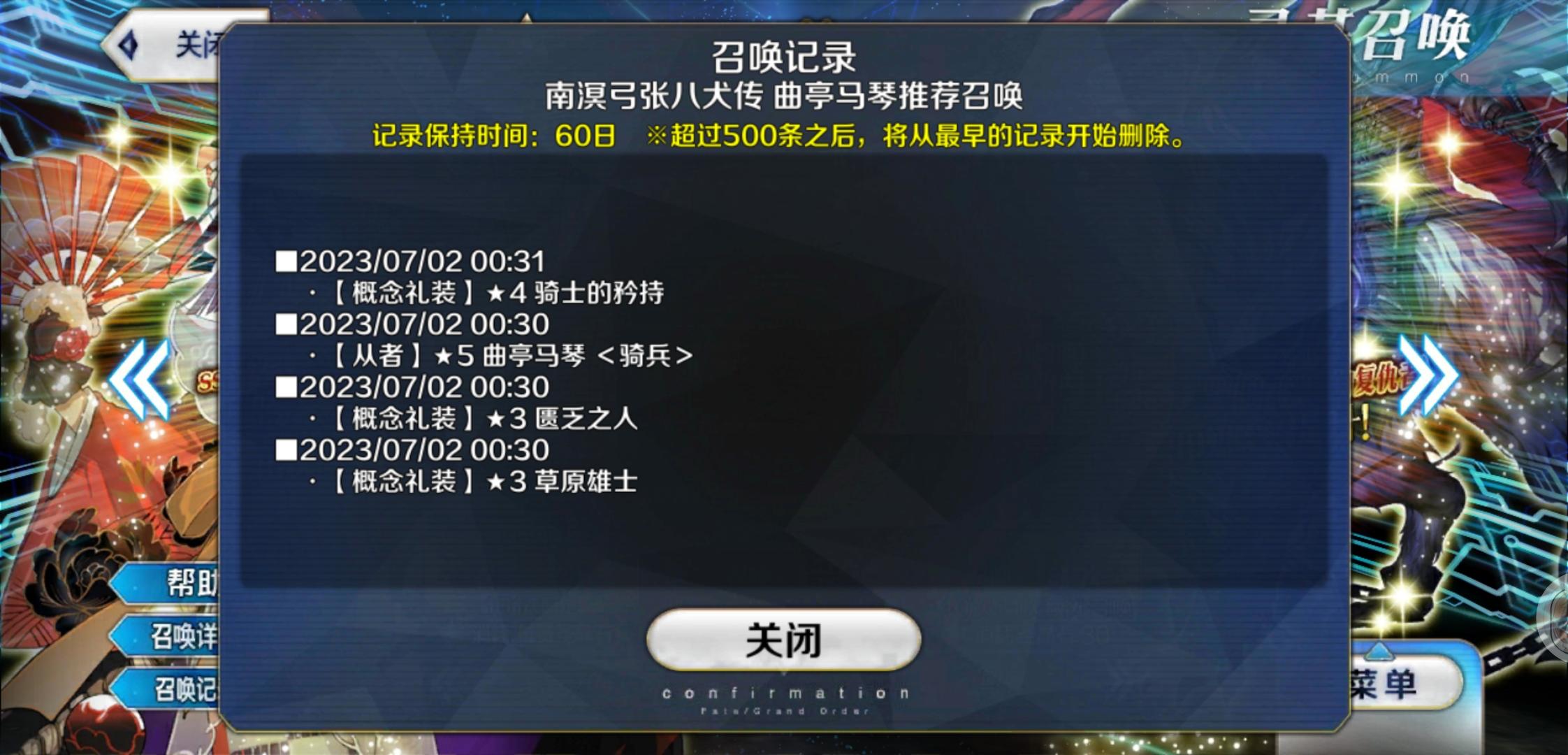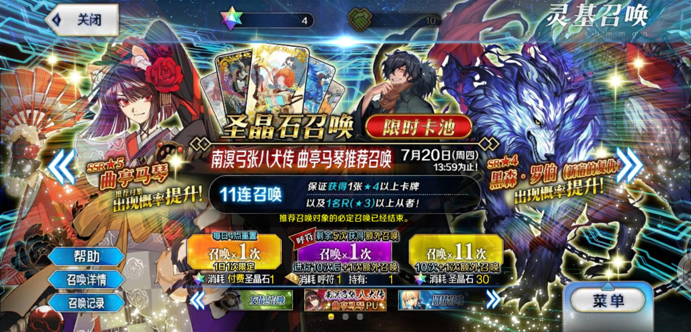 免费5抽,三发入魂抽中up角色曲亭马琴。