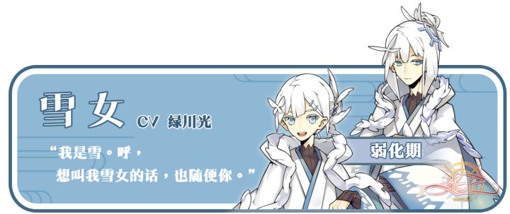 雪女是扶桑国民间广为流传的一种妖怪,长相美艳,擅长制造冰雪。在扶桑人的心目中,雪女是一种很纠结的妖怪,漂亮、温柔,也会在某个瞬间毫不留情地取人性命,美丽而又恐怖。Cv:绿川光出处:关于雪女的记载最早出现在何时,现存两种说法。一个说法是扶桑国著名的连歌师宗祇法师声称在越后国的山中见过雪女,并在其著作《宗祇诸国物语》中进行了相关的记载,这也是扶桑国第一本记载雪女传说的典籍。另一个说法是雪女的传